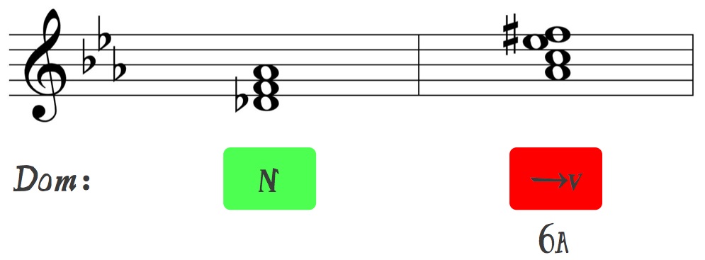 Se poñemos o foco nas notas que rodean por proximidade ós sons de tónica e dominante, (re♭ e si, la e fa♯), e os relacionamos con estes acordes, decatarémonos de que, no caso do napolitano, os dous “satélites” da tónica, 2↓ e 7↑, representan a nota característica do napolitano e súa resolución habitual na sensible dunha dominante, mentres que, o intervalo de 6ª aumentada se orixina ca suma dos “satélites” da dominante que son o 6 e o 4↑.