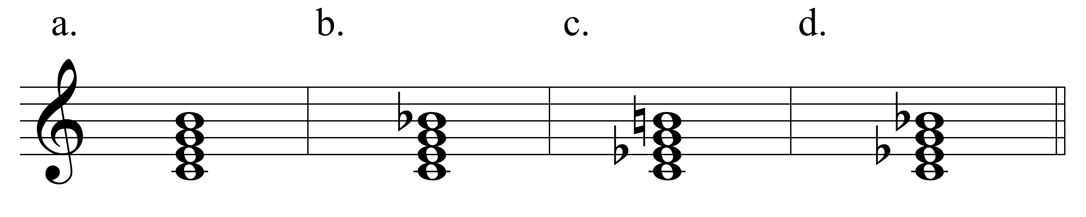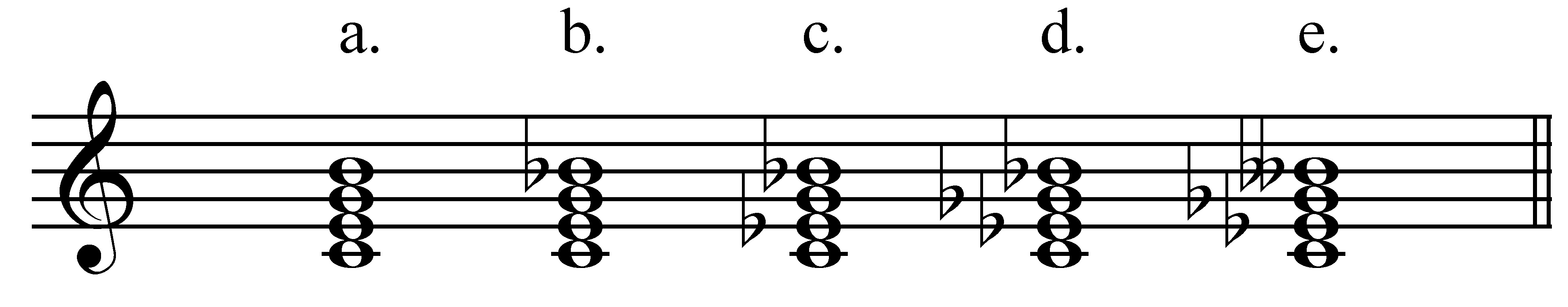 Escoita de novo os dous fragmentos anteriores e relaciona cada un dos graos con sétima cos tipos de cuatríades a, b, c, d y e. Estes están ordenados de esquerda a dereita no centro da imaxe.