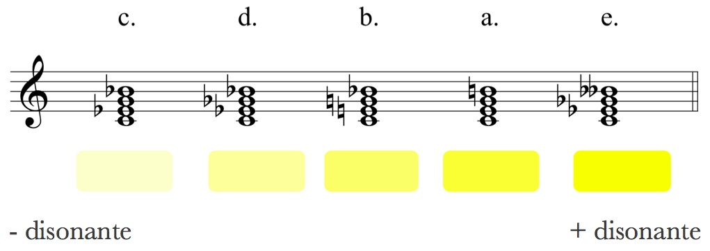 Na seguinte imaxe, as distintas gradacións da cor amarela, representan o grao de disonancia de acordo con esta clasificación.