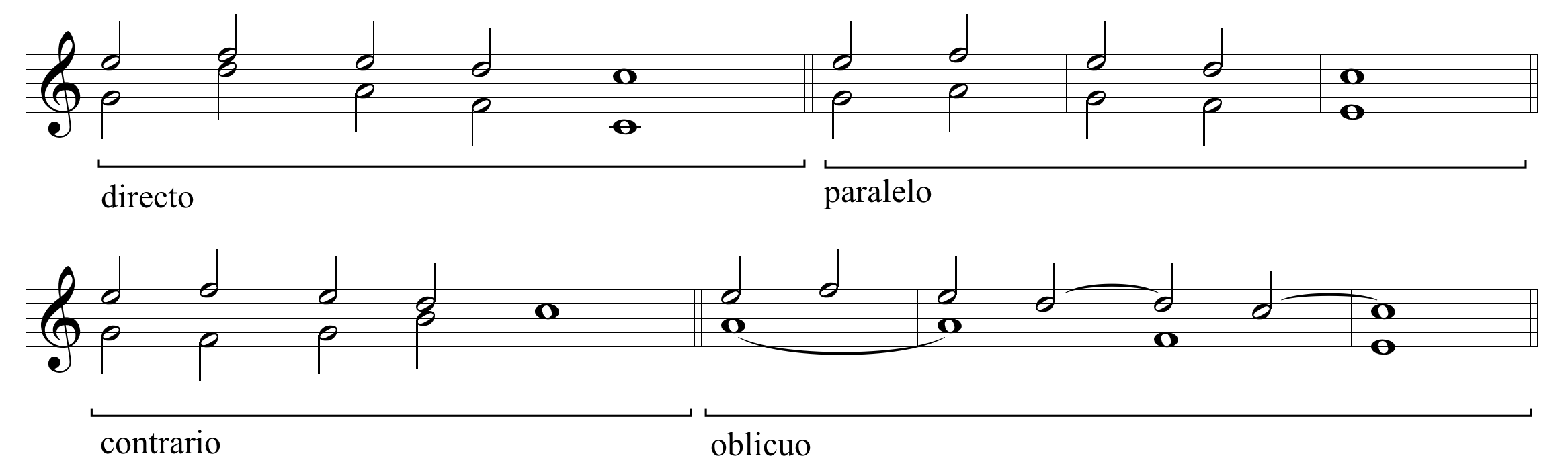 1) Directo: Cando dúas voces se moven na mesma dirección, ascendente ou descendente. Unha das voces realiza sempre un intervalo máis amplo que a outra, coma se pode ver nos seguintes gráficos, resultantes de reducir o perfil melódico de cada voz a liñas melódicas.