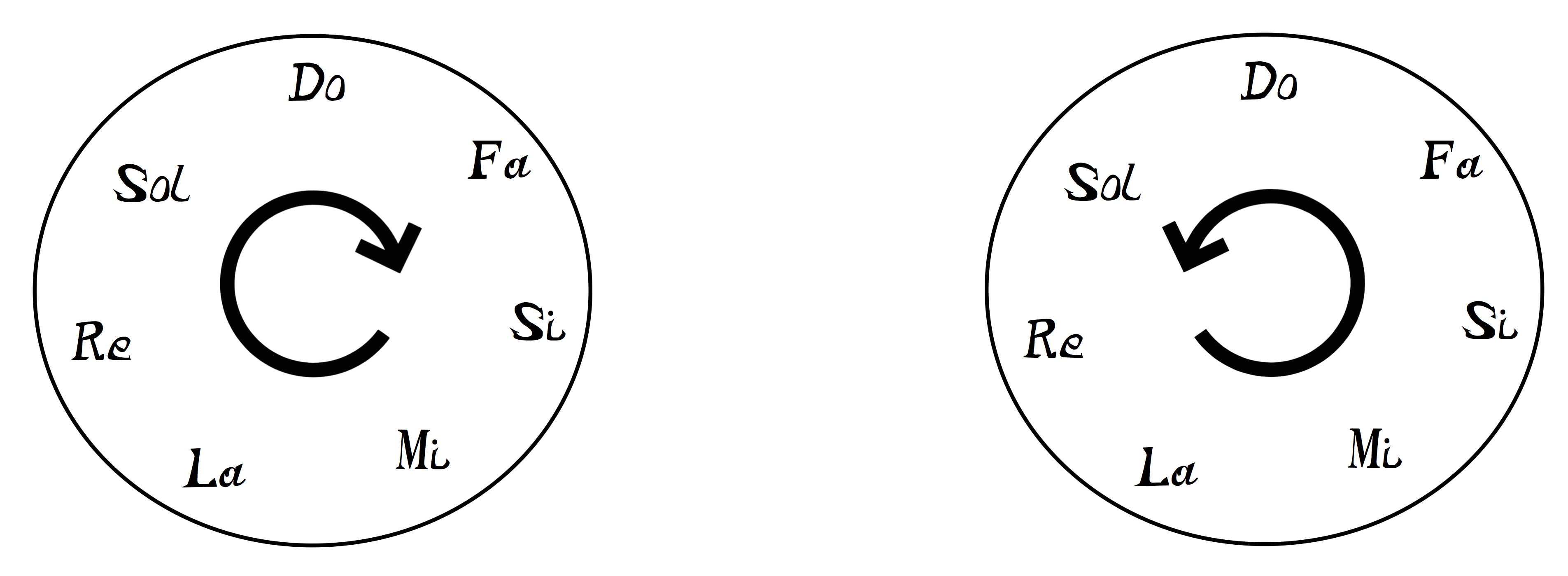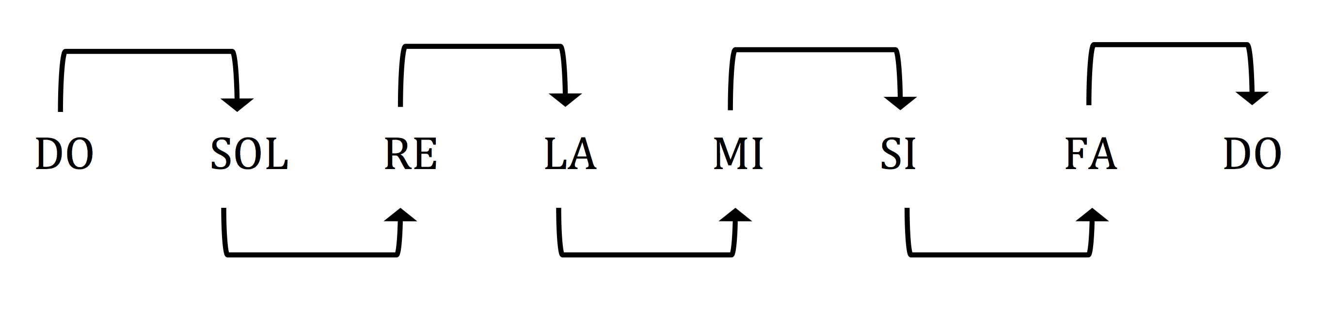 Representaremos este tipo de progresións harmónicas por medio de dous círculos coas notas fundamentais dos acordes e unha frecha circular. O círculo que vai no sentido das agullas do reloxo é o de quintas, e o que vai no sentido contrario ás agullas do reloxo é o de cuartas.
