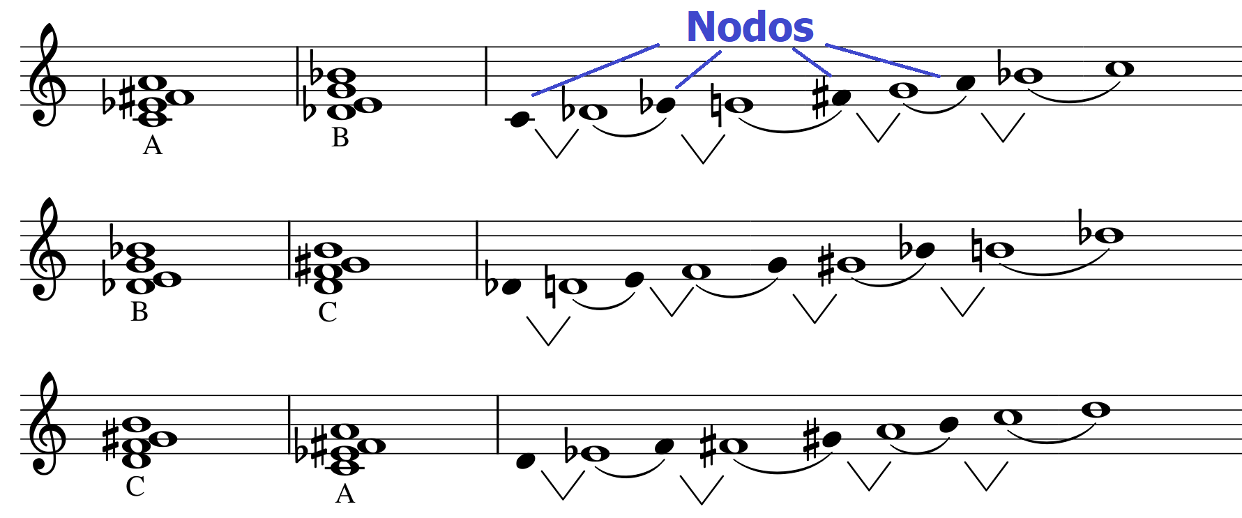 Como soamente existen tres acordes de sétima diminuída, xa que os demais que poidamos construír son enharmónicos destes, podemos combinar ata seis escalas que podemos agrupar en dous modos ou tipos, con tres transposicións “coleccións” cada un: